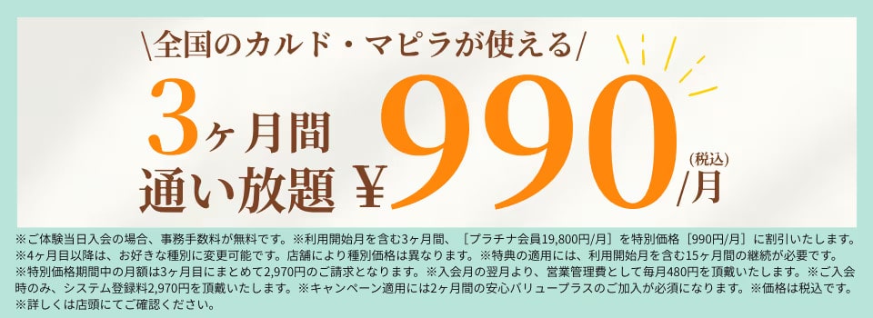 今だけ通い放題プラン(通常10,000円~15,000円前後)の月会費が3ヶ月間990円になります。