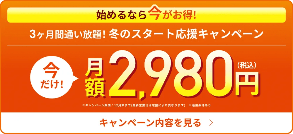 - 通い放題プラン(3ヶ月2,980円通い放題プラン)での入会
